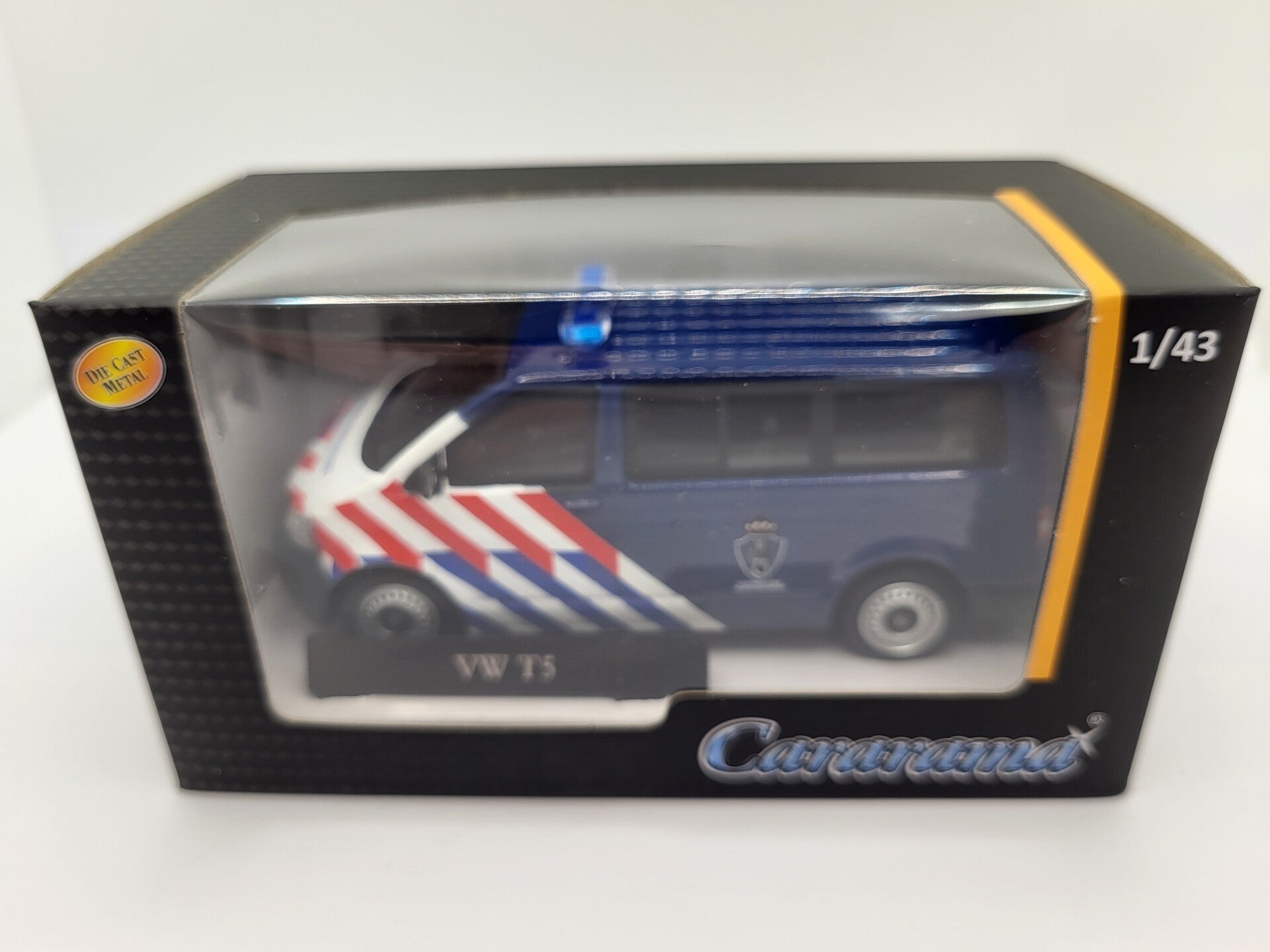 Volkswagen T5 MarechausseeMerk: CararamaSchaal: 1:43Kleur: Wit / Blauw met stripingArt.nr: 4-61180X